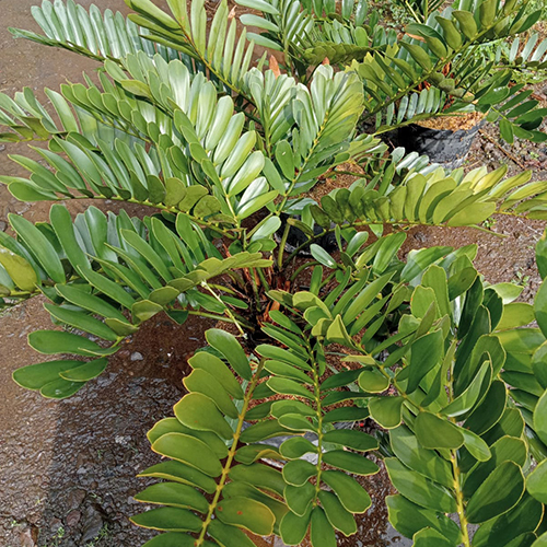 Zamia tumbuh dengan bentuk yang mirip dengan pohon palem, dengan batang yang pendek dan tebal serta daun yang lebar dan panjang. Tumbuhan ini memiliki daun yang terdiri dari sejumlah kecil daun majemuk dan pelepah daun yang tajam. Bunga zamia muncul dari pusat tumbuhan, namun bunga tersebut kecil dan tidak terlalu mencolok.